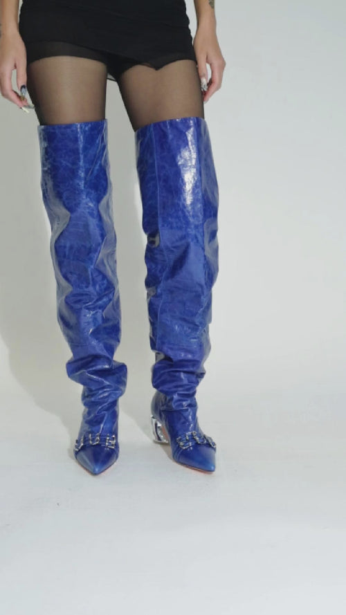 Defined by its relaxed slouch and sculptural heart shaped heel, CHOOM moves effortlessly between structure and softness. Crafted in artisanal polished leather with tonal depth, designed to develop rich patina and character with wear. The elongated pointed toe and fluid shaft can be styled over-the-knee or scrunched below, creating natural movement with every step.