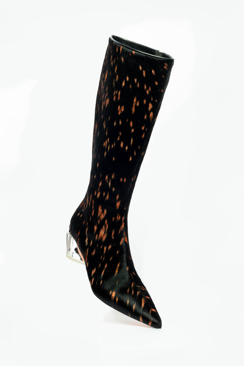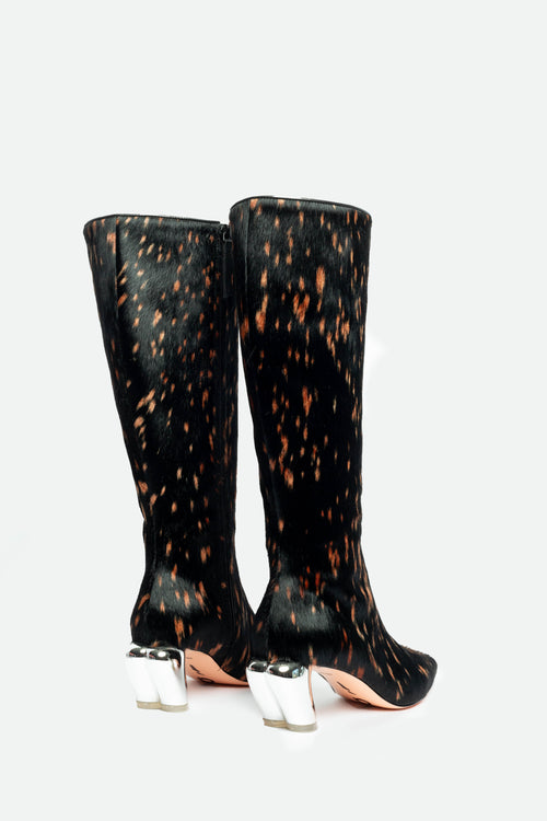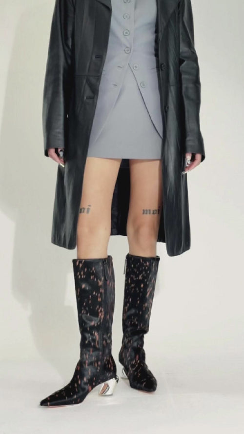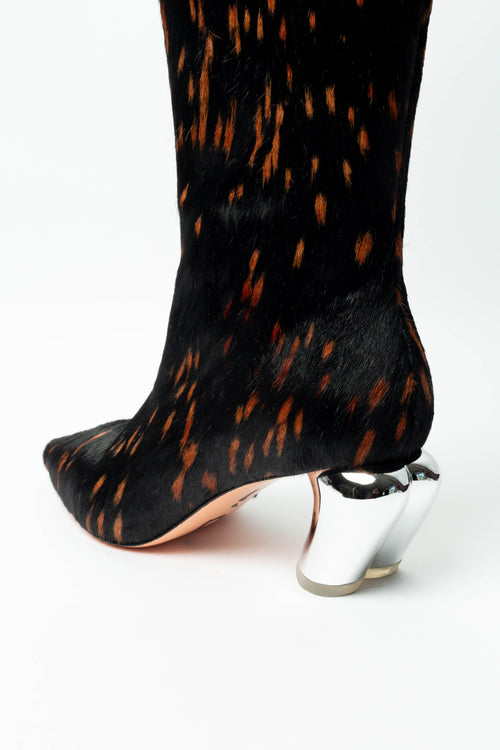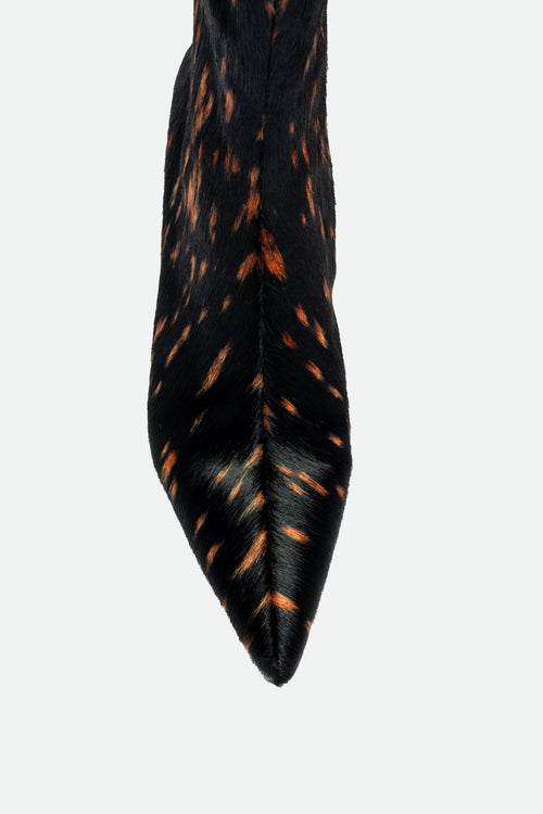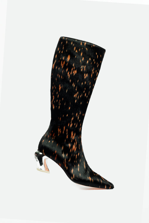 Defined by its elongated point toe and sculptural heart shaped heel, CHAI balances sharp elegance with playful edge. Crafted in pony calf hair leather with natural variation in texture and pattern, making each pair unique. Lined in soft nappa leather that softens with wear, set on the perfect heel height for everyday ease.