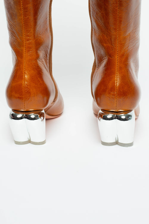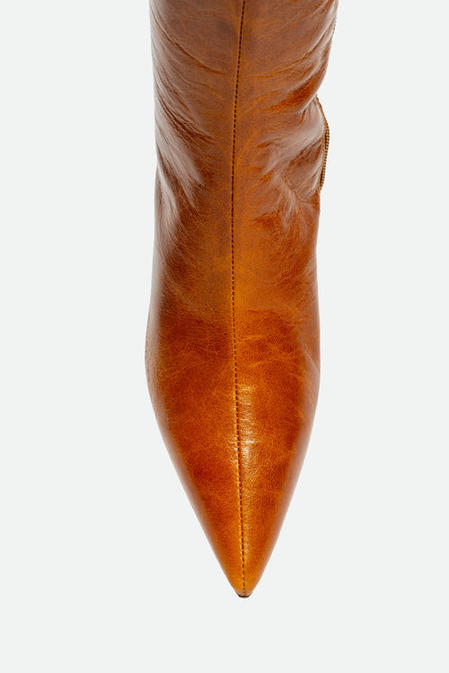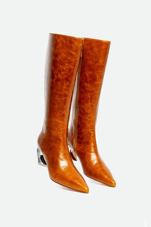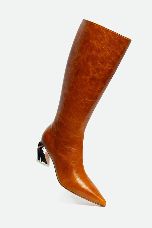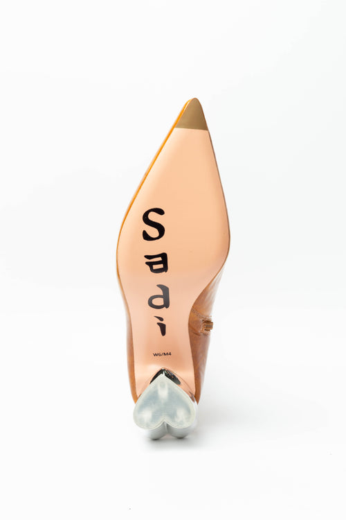 Defined by its elongated point toe and sculptural heart shaped heel, CHAI balances sharp elegance with playful edge. Crafted in artisanal polished leather with tonal depth, designed to develop rich character over time. Lined in soft nappa leather that softens with wear, set on the perfect heel height for everyday ease.