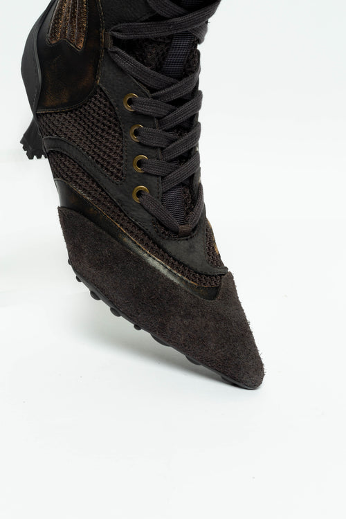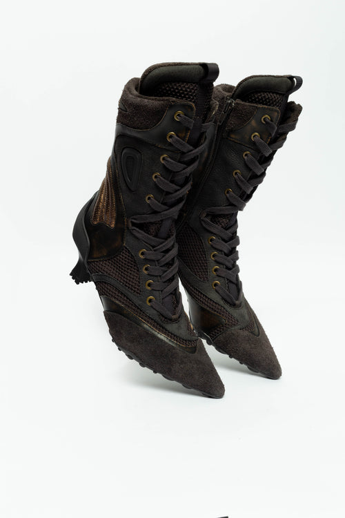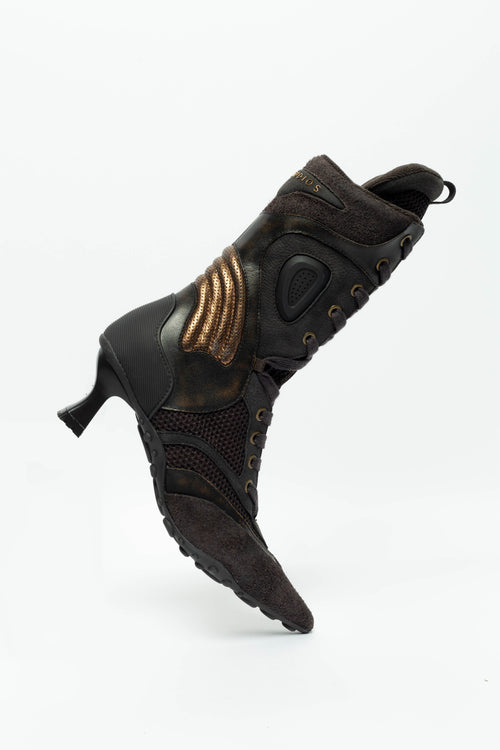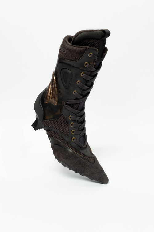 Defined by its lace-up front and athletic-inspired moulded details, CHOO fuses elements of a boxing boot and a moto boot with sculptural elegance. Crafted in mesh, suede and burnished leather with metallic accents, finished with a tread sole for grip and a kitten heel for sharp elevation. Lined in terry cloth with a cushioned footbed for comfort, and finished with an inside zip for easy access.