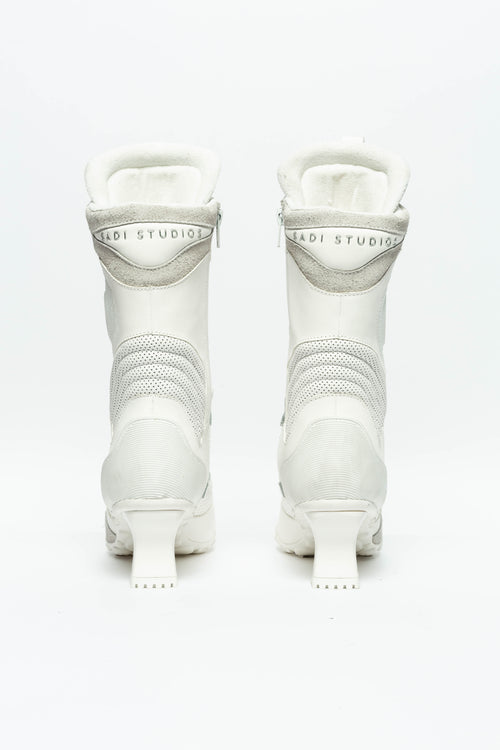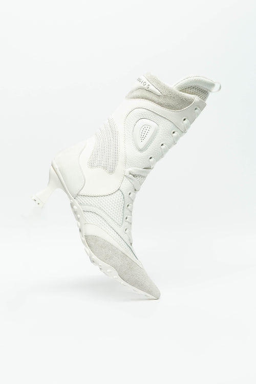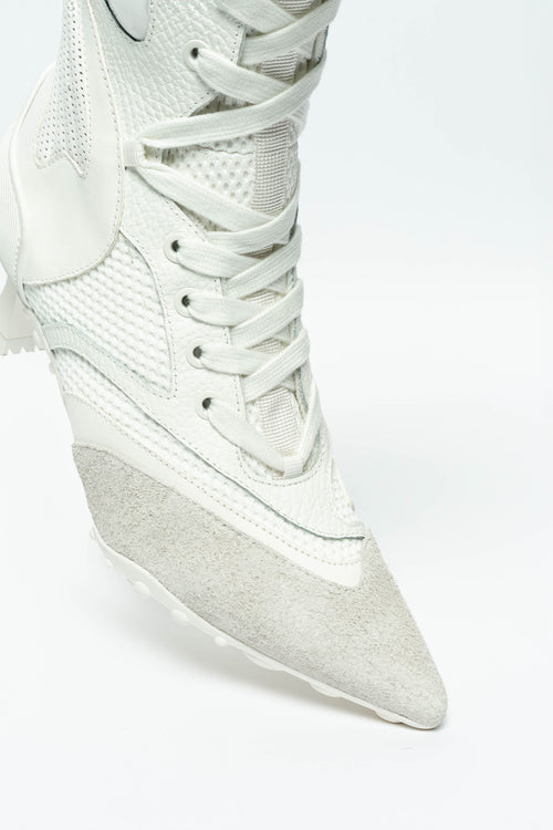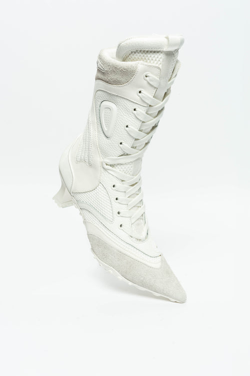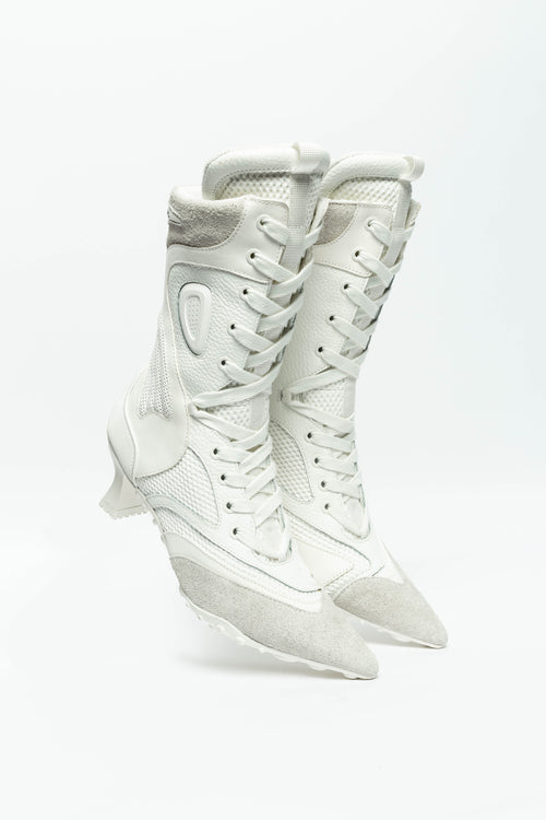 Defined by its lace-up front and athletic-inspired moulded details, CHOO fuses elements of a boxing boot and a moto boot with sculptural elegance. Crafted in mesh, suede and burnished leather with metallic accents, finished with a tread sole for grip and a kitten heel for sharp elevation. Lined in terry cloth with a cushioned footbed for comfort, and finished with an inside zip for easy access.